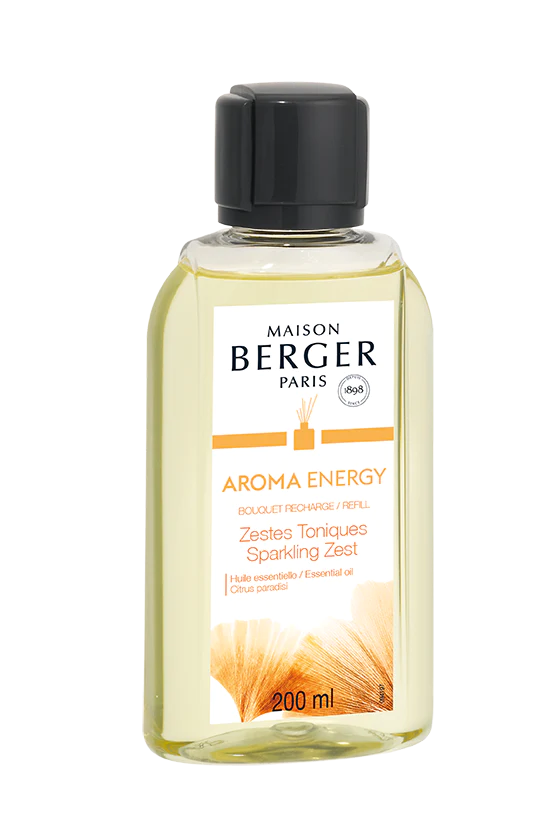 Fragrance refill for scented bouquet containing 200ml of AROMA Energy Sparkling Zest. An extremely fresh and tangy fragrance for a dynamic and energizing atmosphere. A flight of citrus notes rounded off with a veil of musk.