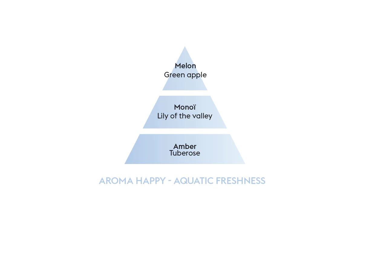 In the Aroma collection, this Happy Aquatic Freshness version is the essence of well-being. The essential oil of eugenol releases its uplifting and invigorating virtues, while the olfactory composition gives off the scent of crisp green apple and the watery flavors of summer melon. The heart is dominated by monoi and the sunny accents of a floral bouquet exalted by frangipani flowers, which settle on the rounded softness of an amber base and the sweet trio of amber, musk, and peach.