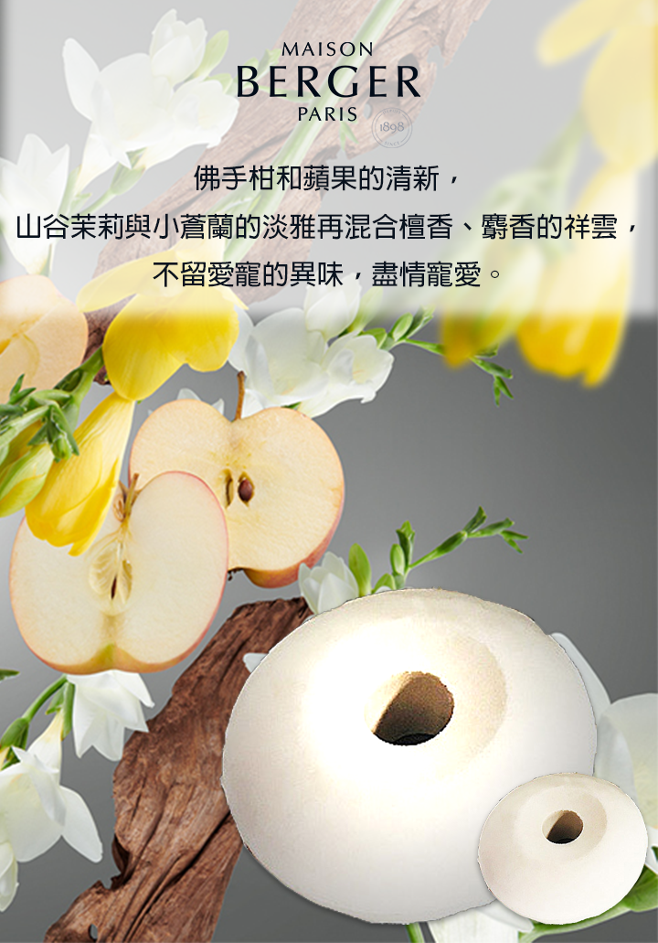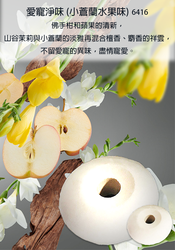 A fresh and floral fragrance to neutralize the smells of our four-legged friends. 佛手柑和蘋果的清新, 山谷茉莉與小蒼蘭的淡雅再混合檀香、麝香的祥雲,不留愛寵的異味,盡情寵愛。