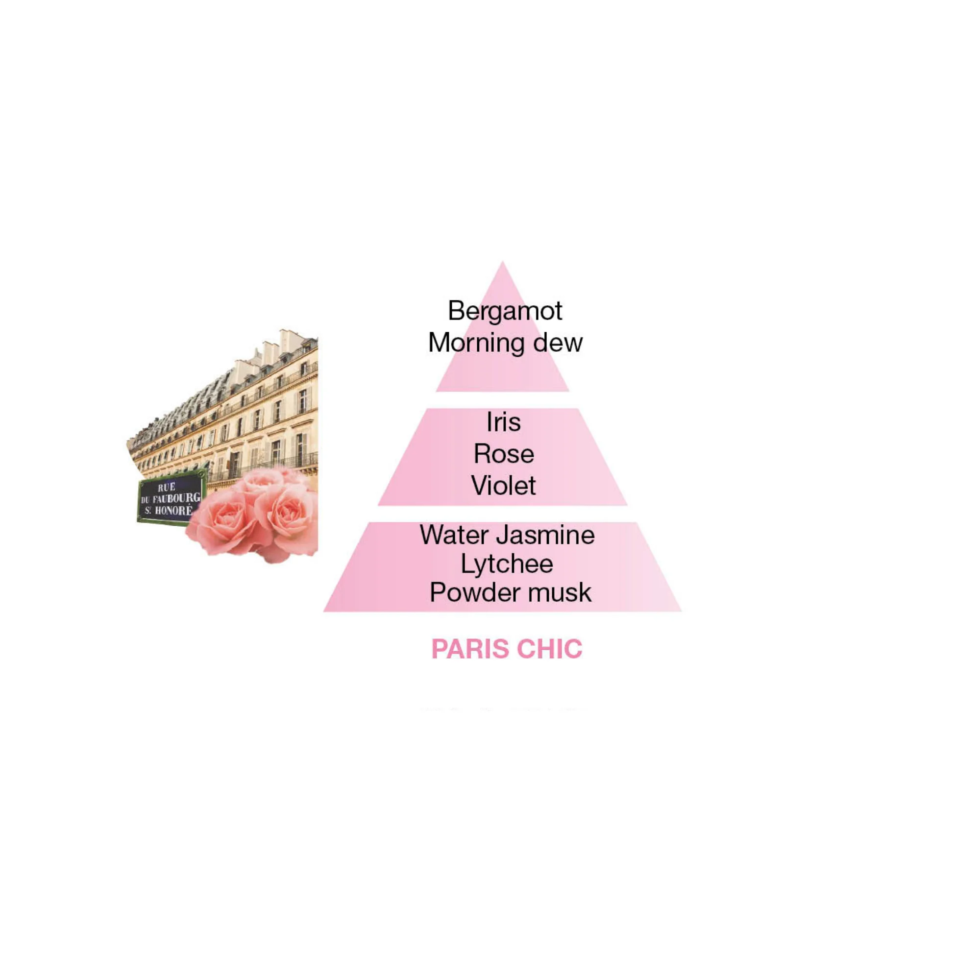 The Paris Chic fragrance is a delicately floral fragrance, the timeless incarnation of French savoir-faire. It opens with a refreshing bouquet of citrus fruits and then leads to a classic rose garden where the splendid Bulgarian rose coexists with the elegance of iris and the candor of violet. Totally modern, the exotic flavor of the lychee, enhanced by the sunny aroma of the vine peach, is underlined by the powdery softness of musk. A walk among the roses of the Tuileries garden!