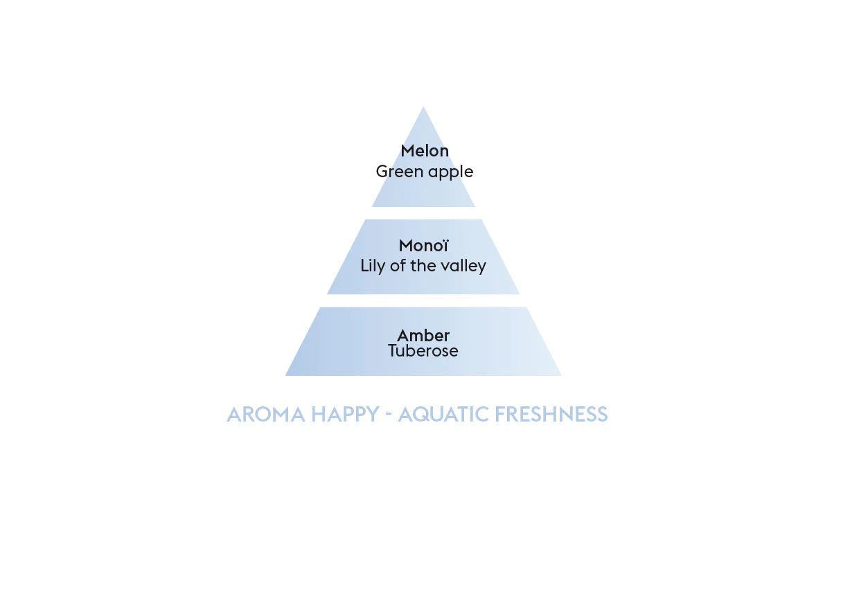 Aroma Happy Mist Diffuser Refill and its aquatic freshness are a real booster for your morale. The fragrance begins with juicy fruity notes of green apple, grapefruit and melon, very fresh with a strong appeal. The monoï comes to bring a little summer air combined with the floral subtlety of lily of the valley in heart notes. Then, the sensual velvet of the fishing, the exoticism of the vanilla and the coconut are sublimated by warm and amber notes. The olfactory composition enriched with clove essential oil helps to give you tone. The Aroma Happy Mist Diffuser Refill is ready to use! Just pour the solution into your mist diffuser and enjoy the benefits of this fragrance. The Aroma range is expanding with the launch of this new gesture.