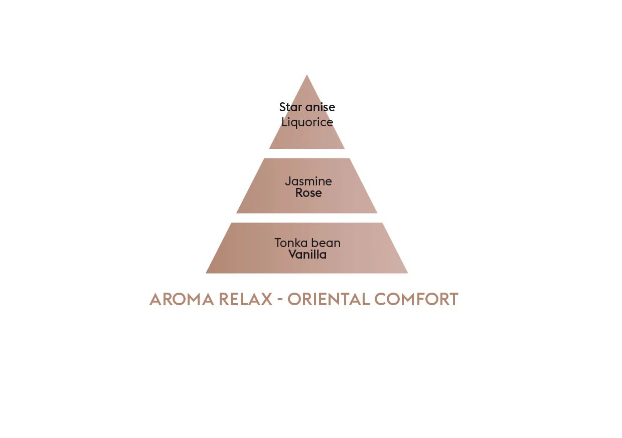 The Aroma Relax Mist Diffuser Refill quickly relaxes the atmosphere. Aromatic and zesty top notes where the star anise, bergamot and liquorice blend in perfect harmony. A floral bouquet in heart, very fragrant, orange blossom, jasmine and rose. To finish on woody, powdery and spicy fragrances of oak moss, tonka bean and vanilla. An olfactory richness that encourages the sweetness of life. This ready-to-use solution is enriched with essential oils of patchouli and guaiac wood that hold relaxing virtues. The Aroma Relax Mist Diffuser Refill is the Oriental Sweetness that is invited in your living room. No need to make hazardous dosages of perfumes and essential oils in your mist diffuser thanks to the innovative Aroma refills.