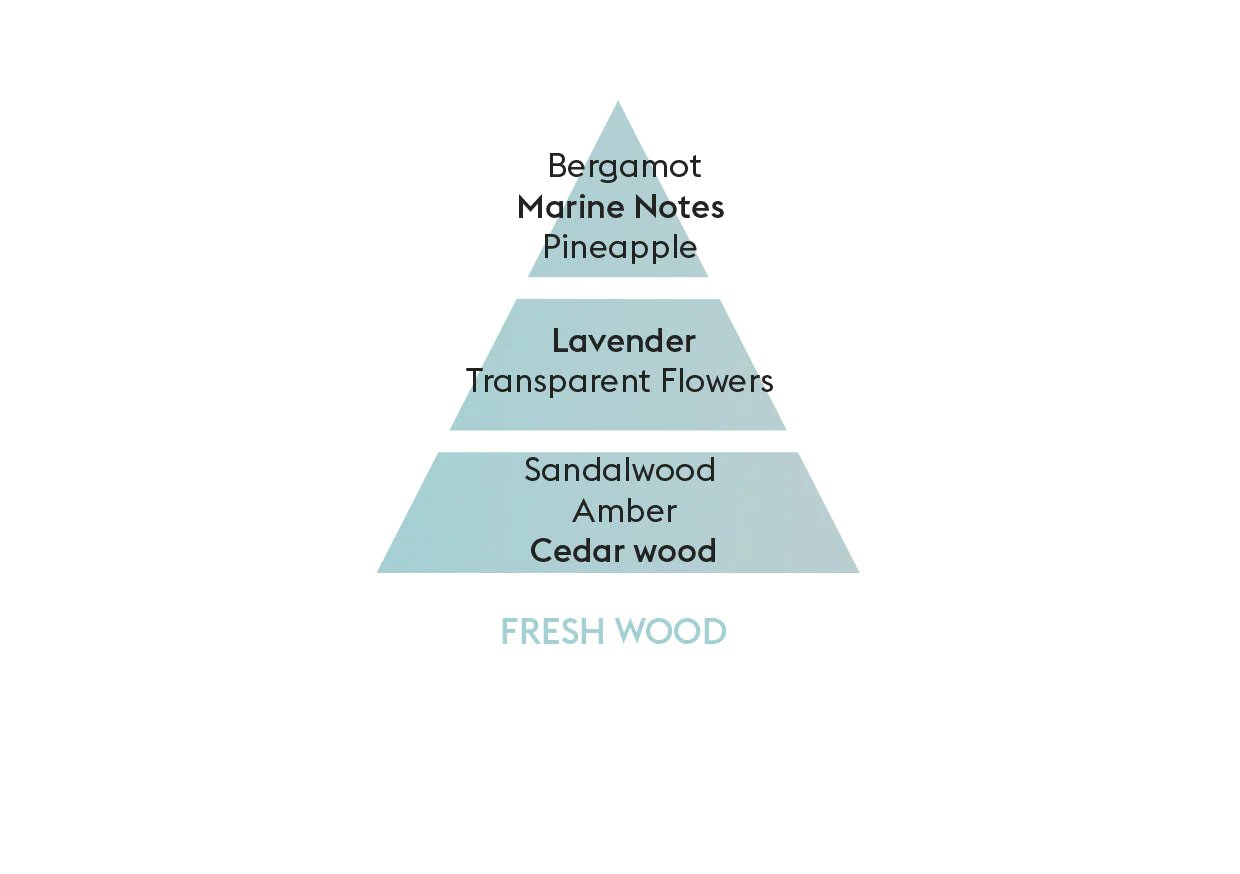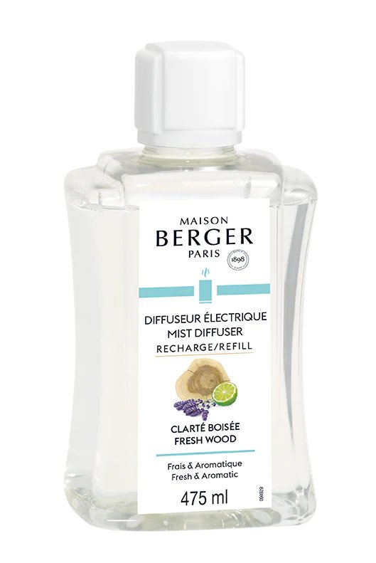 Aquatic, floral, and woodsy notes combine in the Fresh Wood home fragrance to refresh your home. With a light touch, marine notes surge and blend with citrusy bergamot and the fruity scent of pineapple. At the heart, the natural aromatic scents of lavender combine with light floral notes to form an assertive aromatic pair. At the woodsy base, soft sandalwood and elegant cedarwood are accentuated by amber. This fragrance is an invitation to tranquility and relaxation. Use this refill with any Maison Berger mist diffuser to enjoy a fragrant mist evocative of sunny strolls and lush forests.