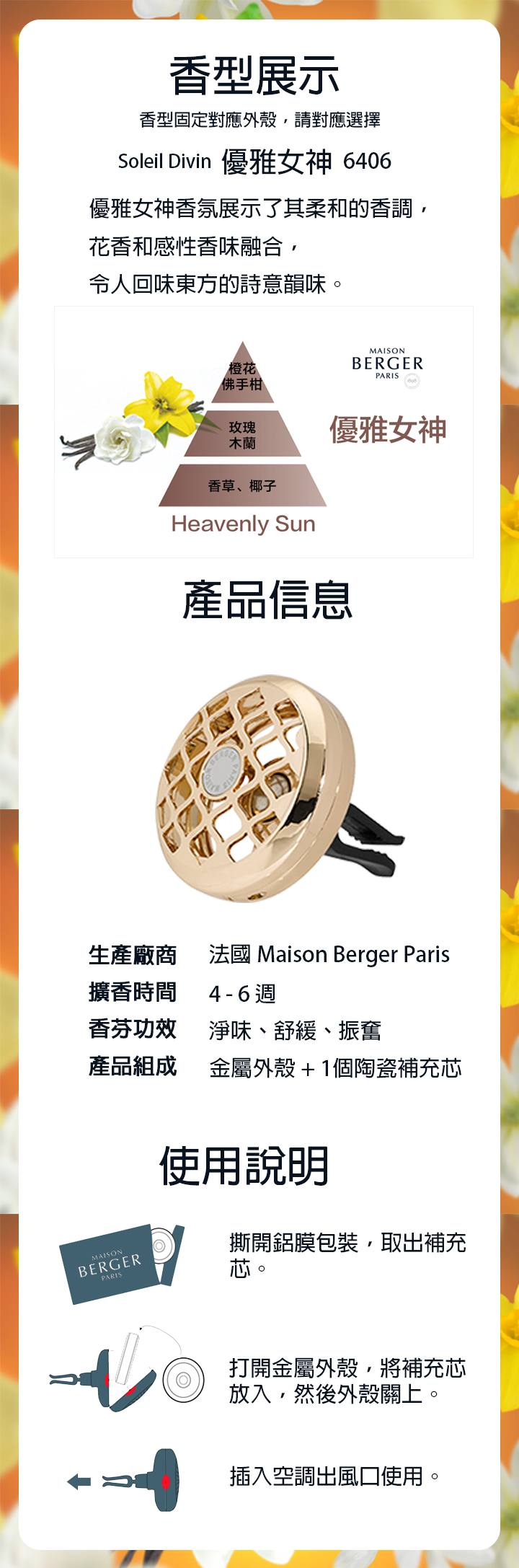 The sound of a car horn suddenly brings you back to reality with a bump… The Heavenly Sun Car Diffuser Refills have offered you a genuine break and you have escaped your daily routine for a few minutes. The master perfume makers at Maison Berger Paris have placed all their know-how at the service of your well-being to offer you ever-increasingly original perfumes. Using the two ceramic refills contained in this pack, your imagination will be stimulated for several weeks!