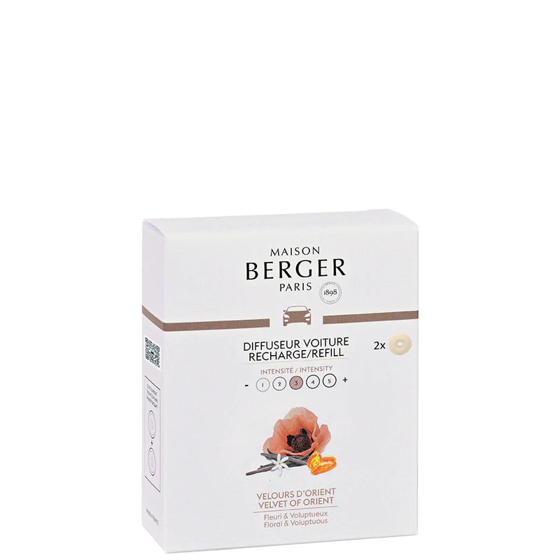 The mysterious Velvet of Orient fragrance is utterly intoxicating. In the head, subtle but persistent notes of coffee flower meld with hazy poppy and zesty citrus. Airy orange blossom and spicy pink pepper entwine in the heart before the composition ends on a contrasting base of warm, woody vanilla, amber, and blond cedarwood. Transform your car rides into luxurious travels through flowers and wood. You won’t be able to get enough of this heady aroma!