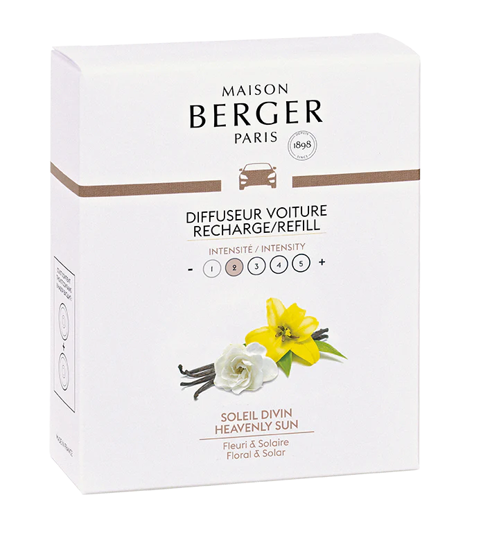 The sound of a car horn suddenly brings you back to reality with a bump… The Heavenly Sun Car Diffuser Refills have offered you a genuine break and you have escaped your daily routine for a few minutes. The master perfume makers at Maison Berger Paris have placed all their know-how at the service of your well-being to offer you ever-increasingly original perfumes. Using the two ceramic refills contained in this pack, your imagination will be stimulated for several weeks!